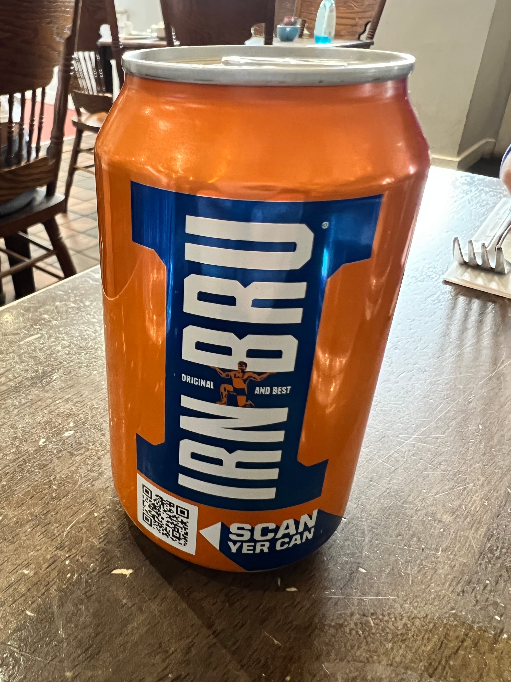 We walked to the restaurant and had a nice little meal. I got a sandwich that could best be described as a haggis melt. Never having had haggis before I wasn’t too sure what to expect but it was delicious (Cathy thought so too). As many of you know I like to try things and I kept seeing this drink called IrnBru all over Scotland. I asked the waitress what it tasted like and she paused and said, it’s indescribable. The can said it had a secret recipe since 1901 so I figured it can’t be that bad, right?. My interest was greater than ever so I ordered one. Hmmm, how to describe the indescribable. I agreed that it was pretty hard to describe but my best description would be “kind of like a carbonated orange jello”. There’s definitely something else in there that I can’t describe. Cathy did not care for it. If you ever get a chance, you should try one yourself and let me know what you think of it.