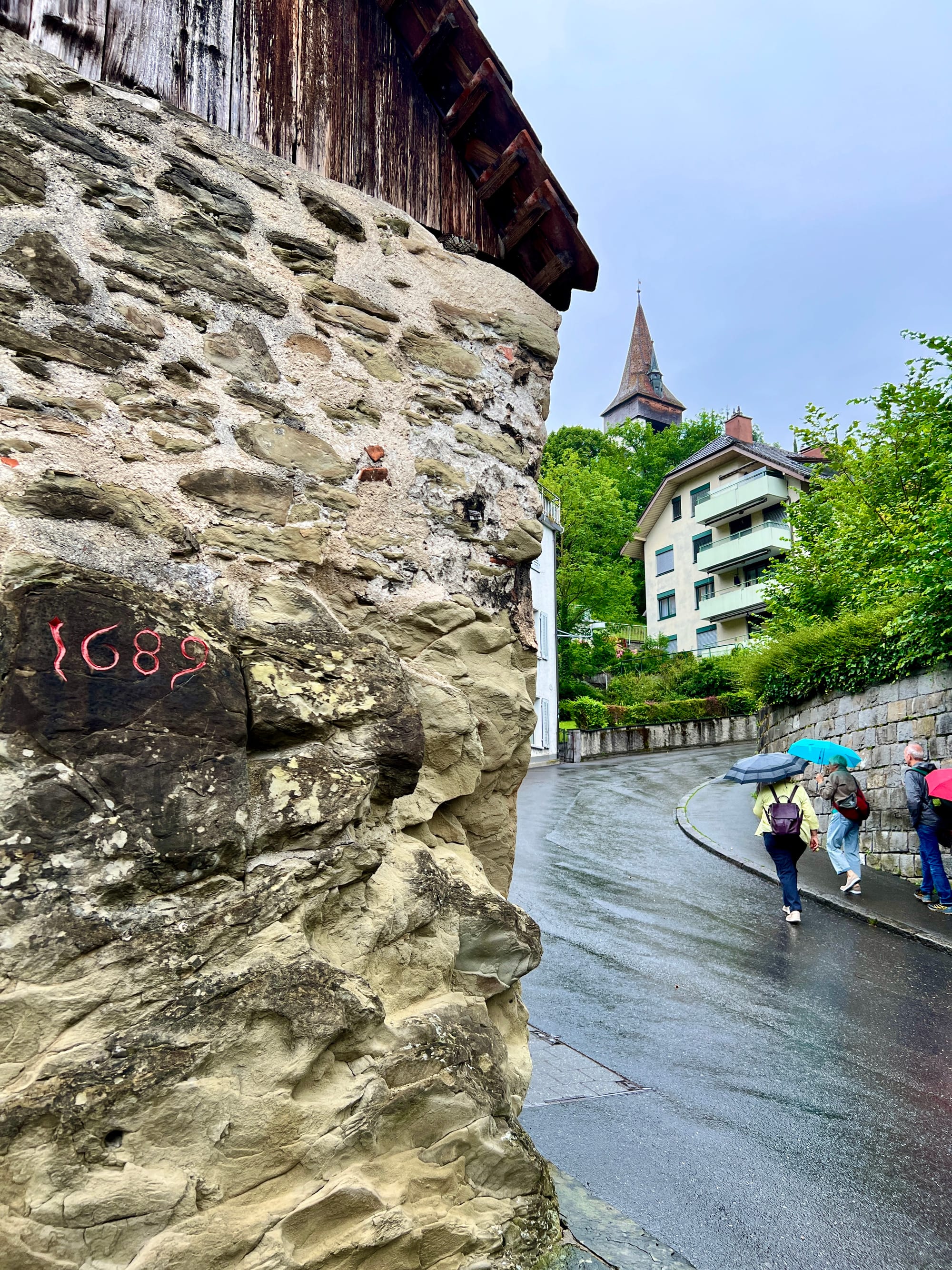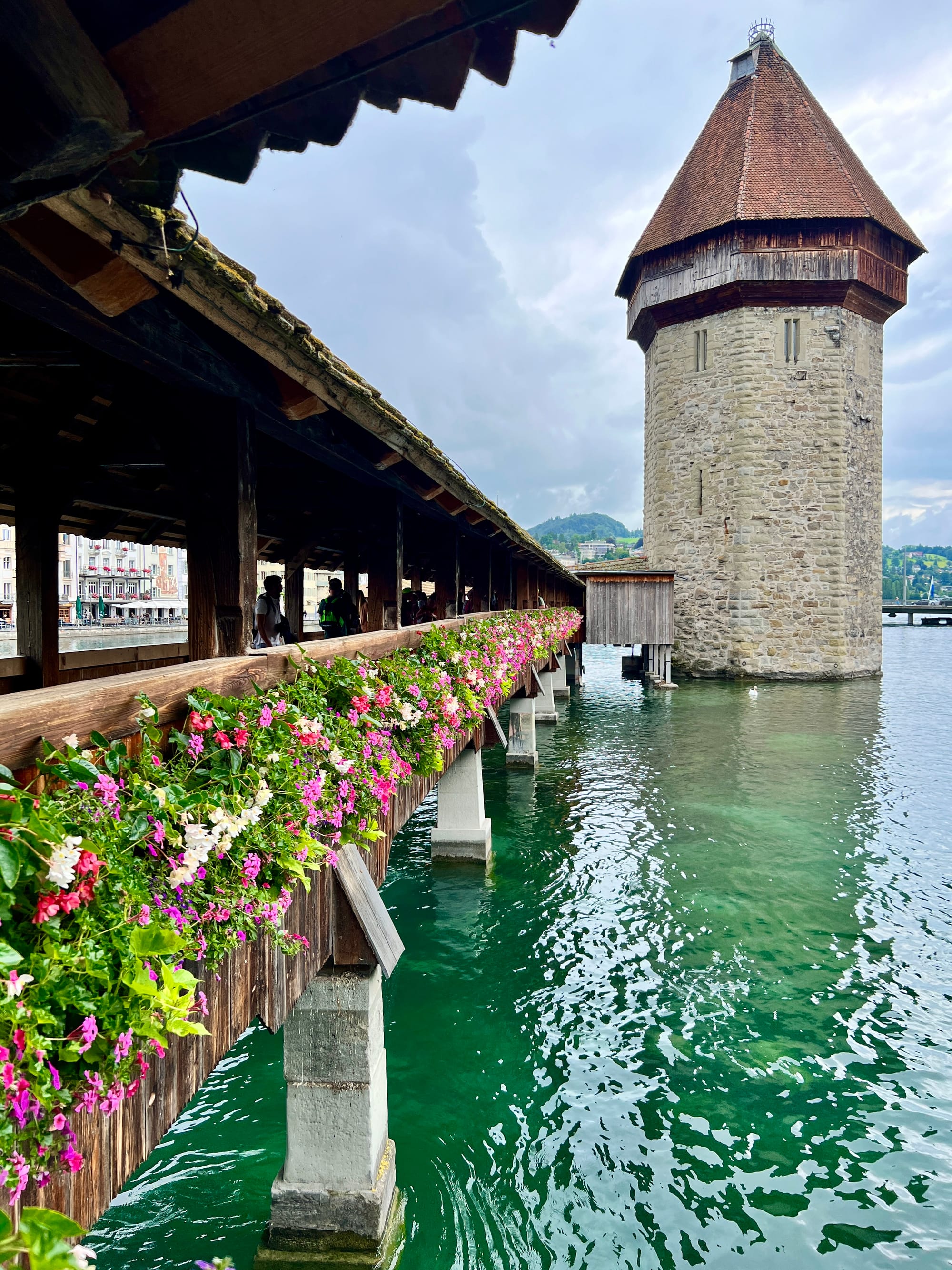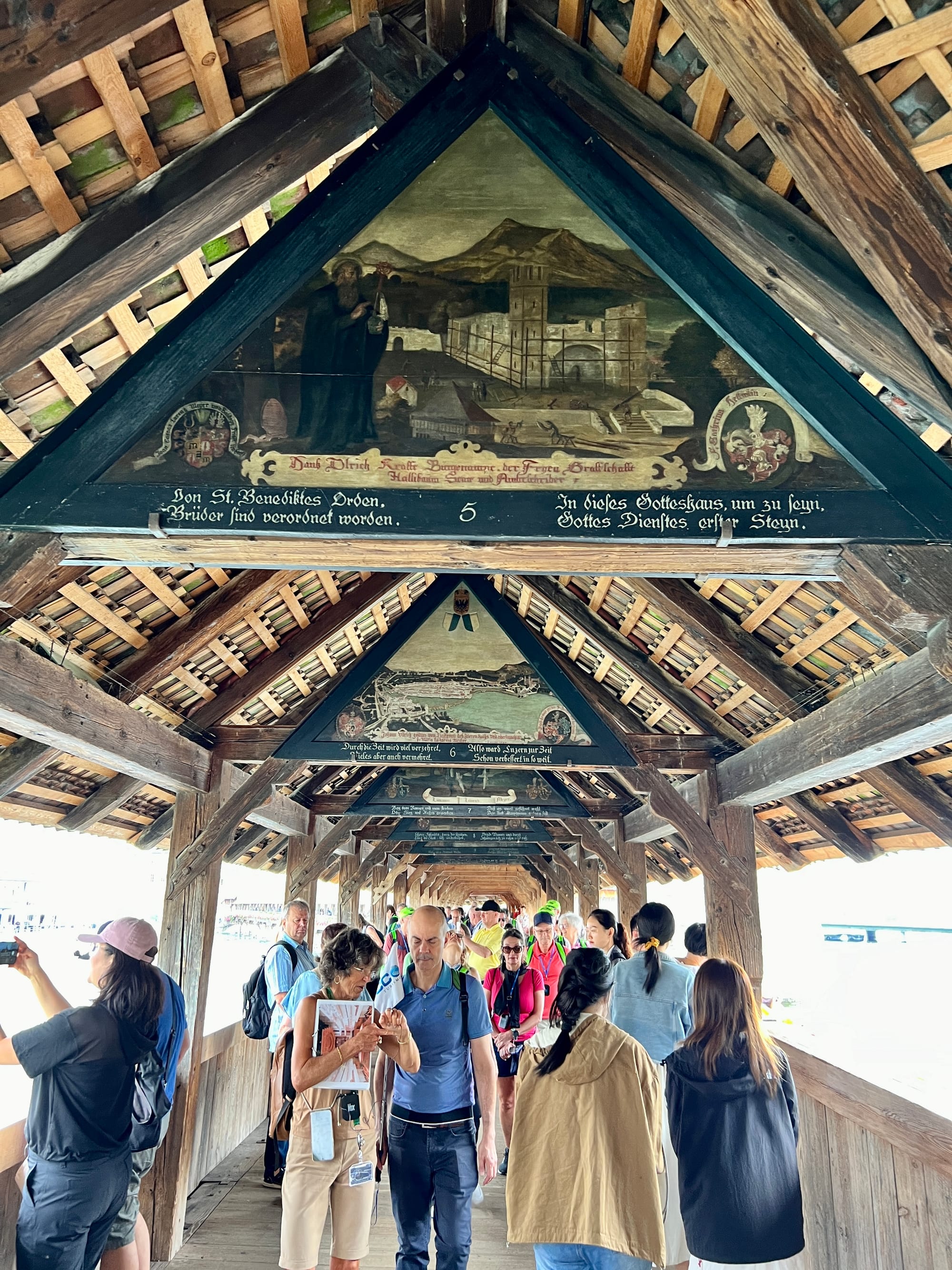 Our first couple of days in Lucerne were cloudy and raining. We made the best of it by getting out and exploring the Chapel Bridge, the oldest wooden covered bridge in Europe. It is a footbridge that spans the river Reuss. The paintings on the interior of the bridge date back to the 17th century although most of them were damaged or destroyed in a fire in the early 90’s. Most of these look like they are restorations.