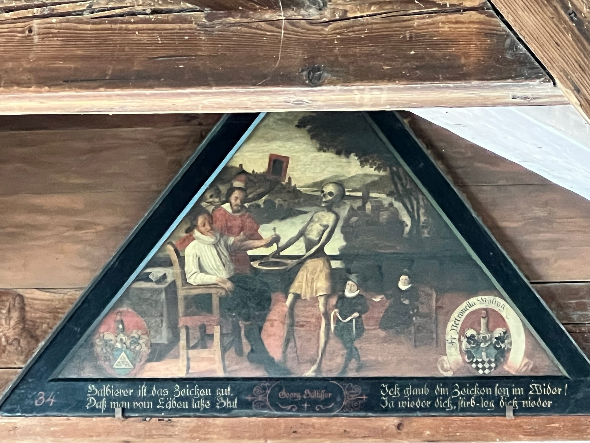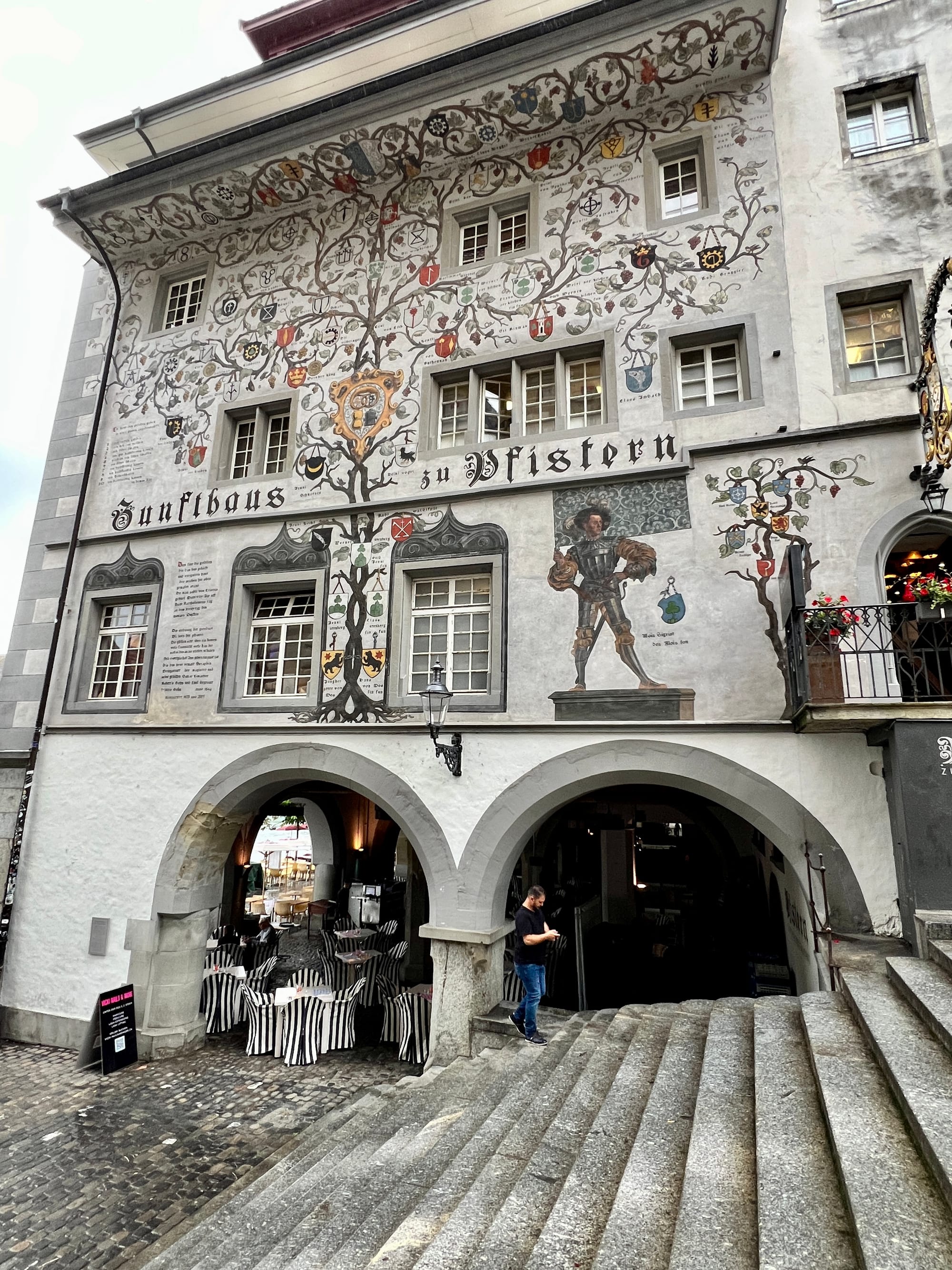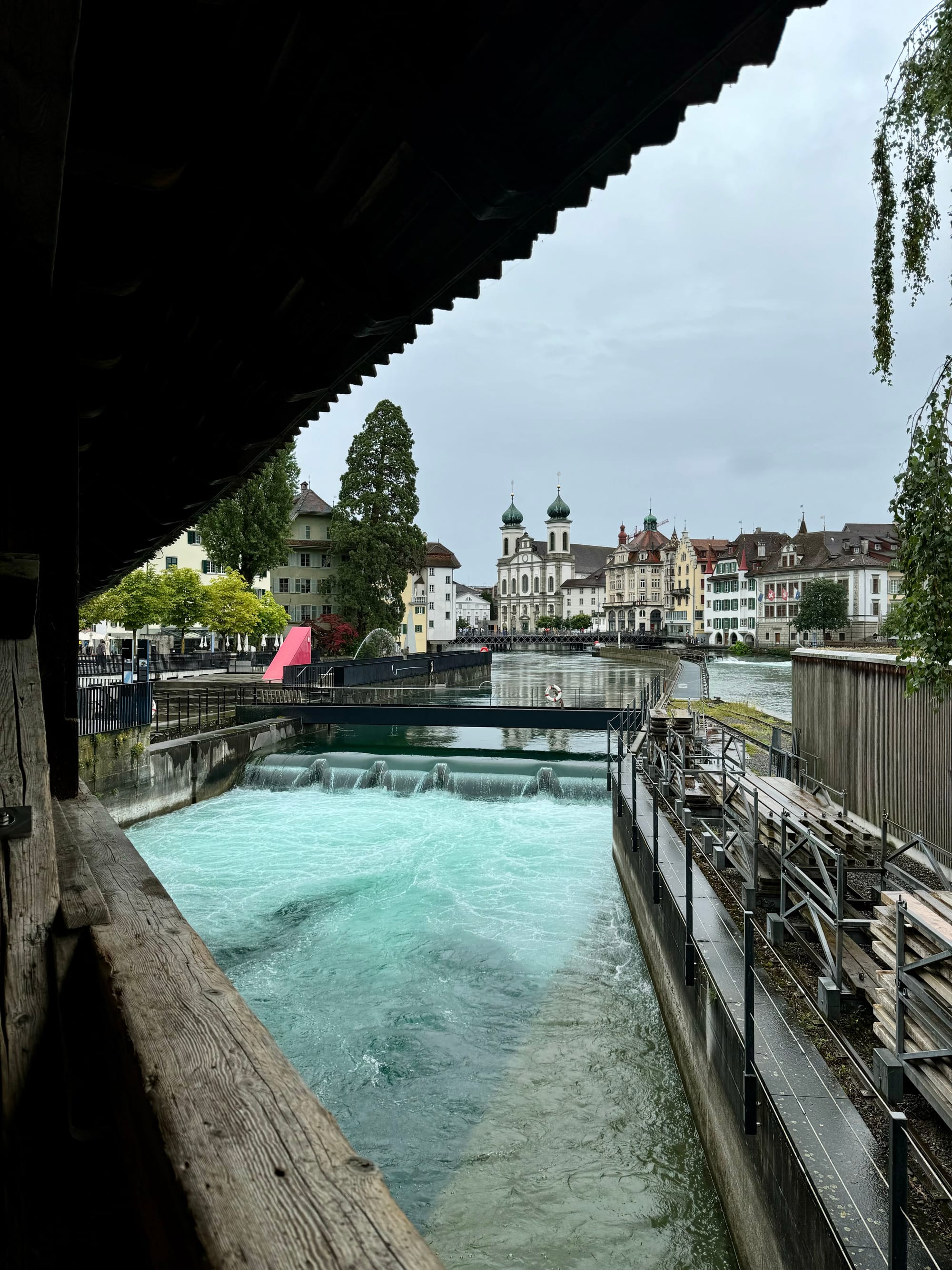 At the end of the wall that terminates at the river we arrived at the second of Lucerne’s footbridges, the Spreuerbrücke, a 15th century footbridge featuring a series of paintings with a death motif. I definitely need to brush up on my German so I can translate these paintings. We wandered around the old town and admired the architecture, the river and the weir system still used today.