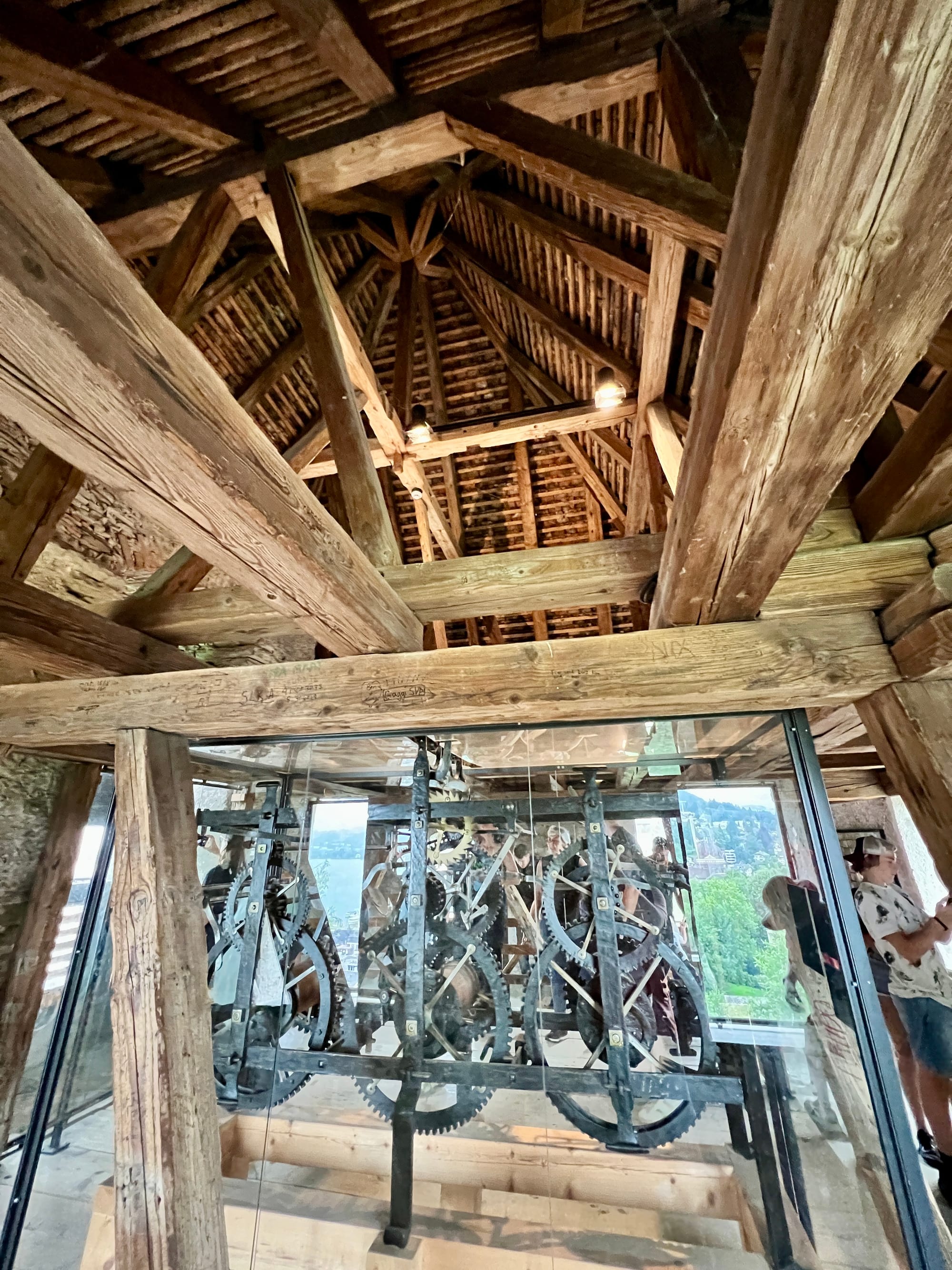 From the bridge, we made our way to the old town to view its many historic buildings with unique paintings and several of the old town fountains which are beautifully decorated and still in use today. We made our way up to the Musegg Wall and its 9 medieval towers that used to protect the city. We climbed the clock tower and checked out the inner workings of the clock. We then made our way down the top walls checking out the towers as we went along. The towers and walls provided great views of the city although the weather was doing it’s best not to cooperate.