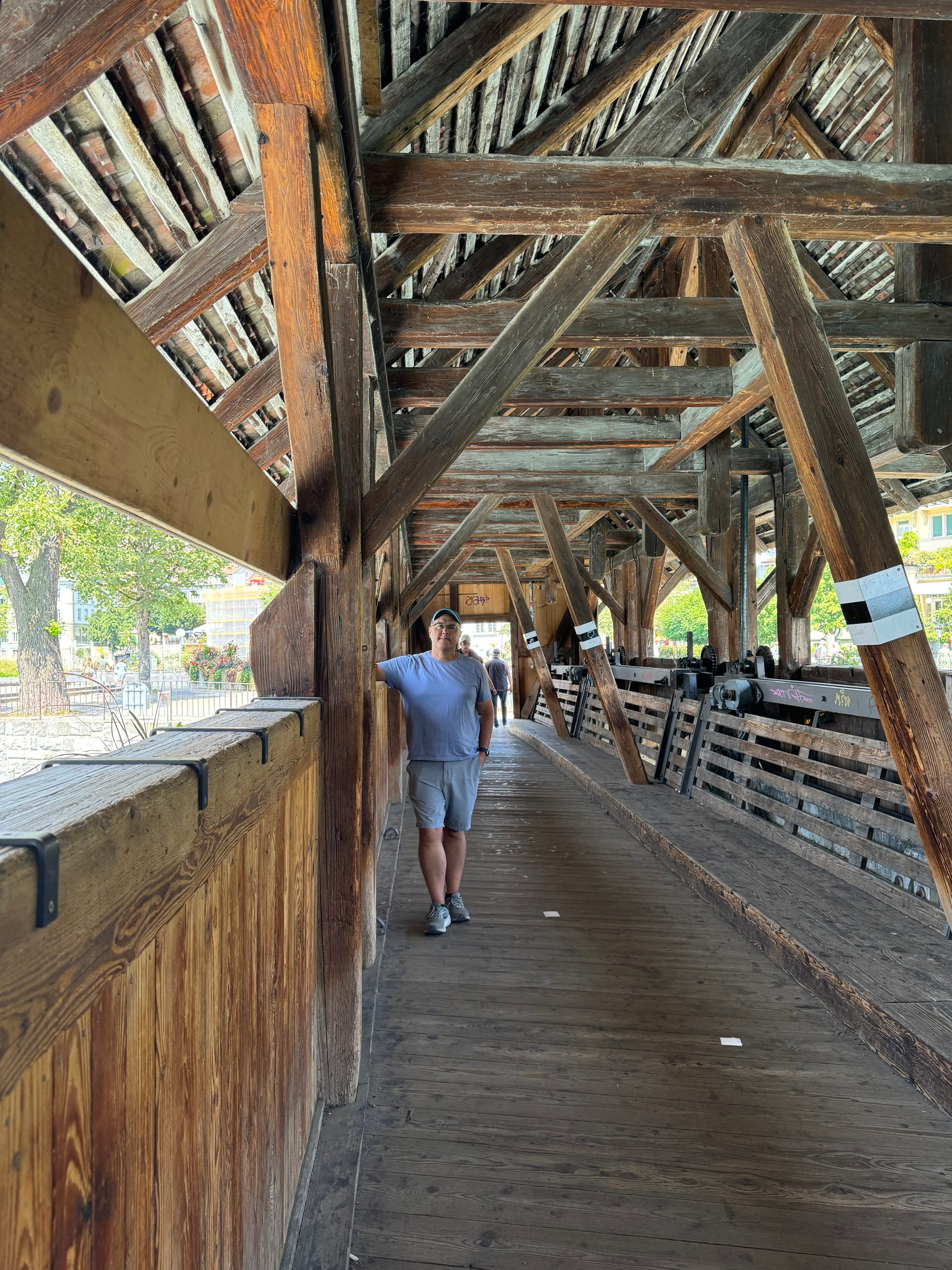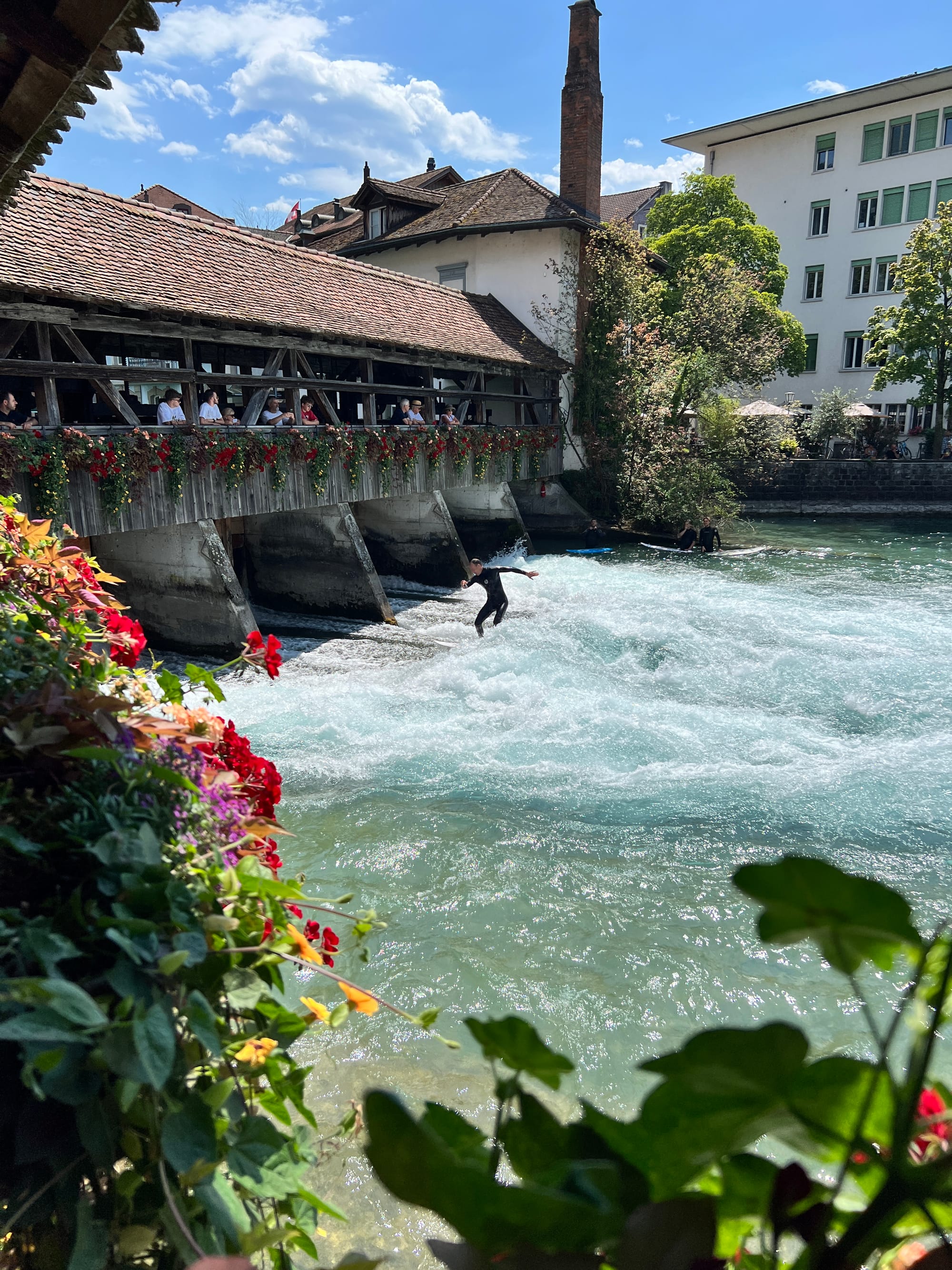While walking across the many beautiful covered wooden bridges we noticed a spot that the surfers were taking advantage of the waves. Just like California? Maybe not but it was very entertaining watching them give it a try.